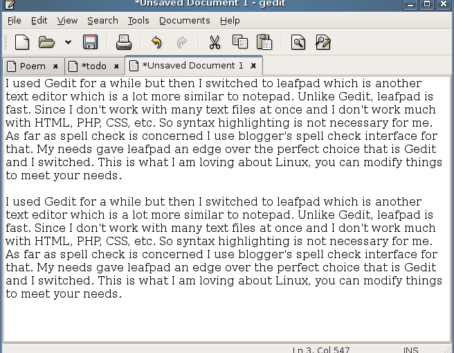 As far as spell check is concerned, I use Blogger’s spell check interface for that. My needs gave Leafpad an edge over the perfect choice that is Gedit and I switched. This is what I am loving about Linux, you can modify things to meet your needs.